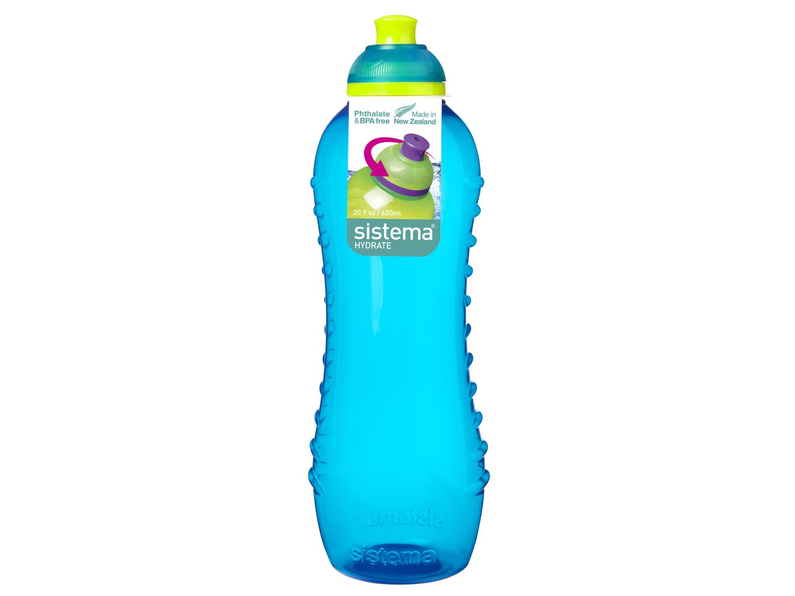 Sistema Twist 'n' Sip-flessen hebben een uniek deksel waarmee de fles kan worden geopend en gesloten met een simpele draaibeweging en zonder dat de vingers de punt van de drinktuit raken - een hygiënischer manier van drinken.