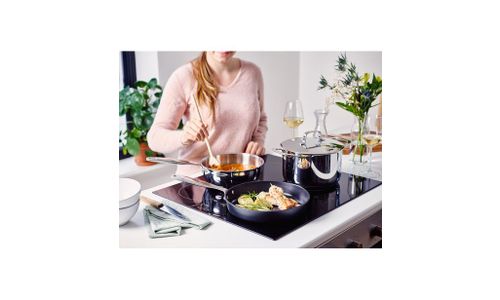 - Door de rechte randen, heeft deze pan 20% extra braadoppervlakte. Ideaal om grote stukken vlees of vis te braden.